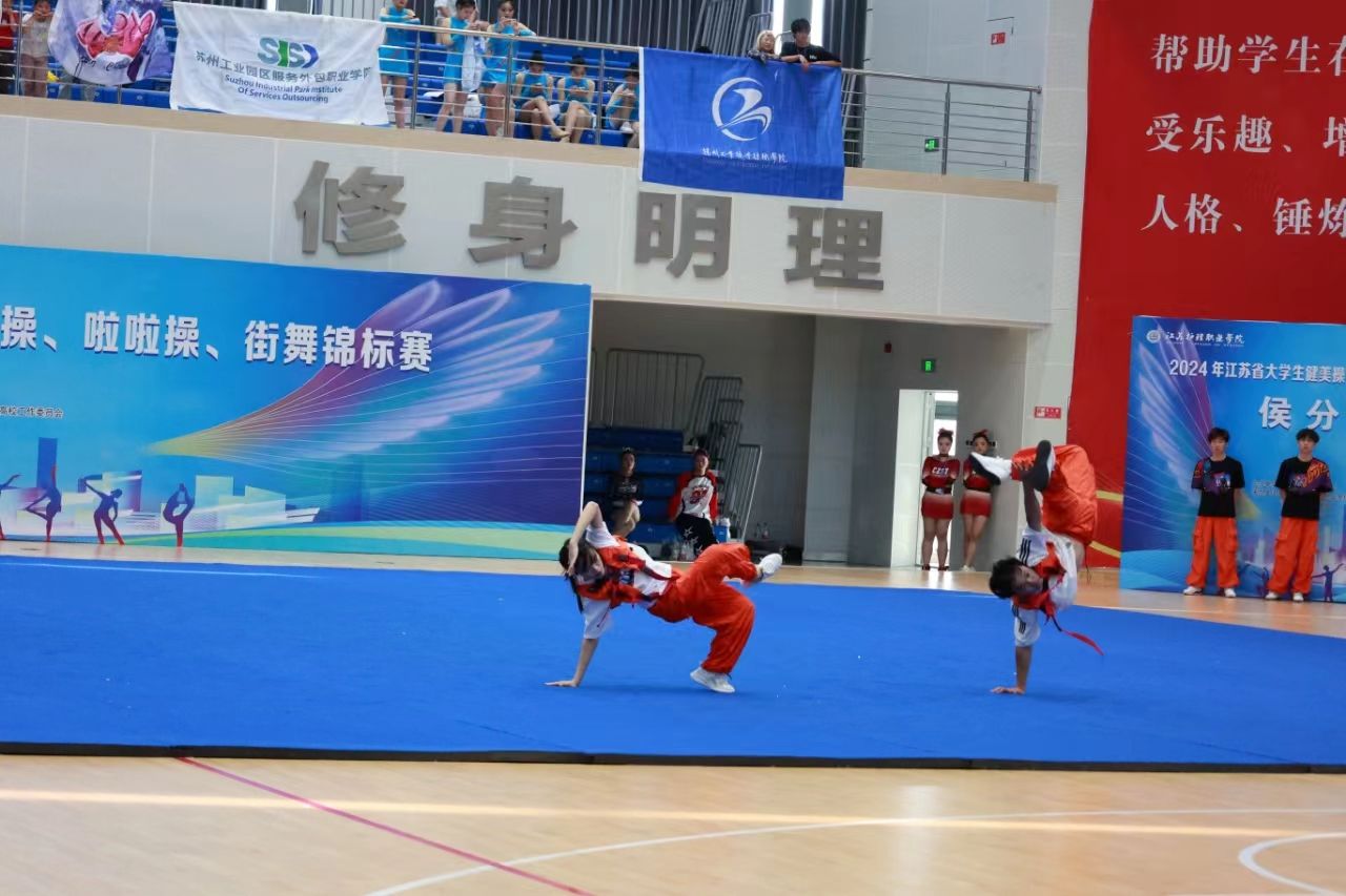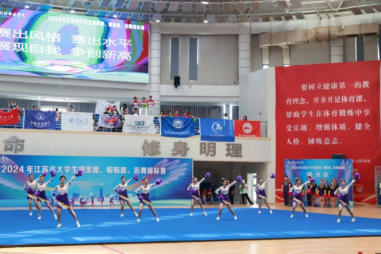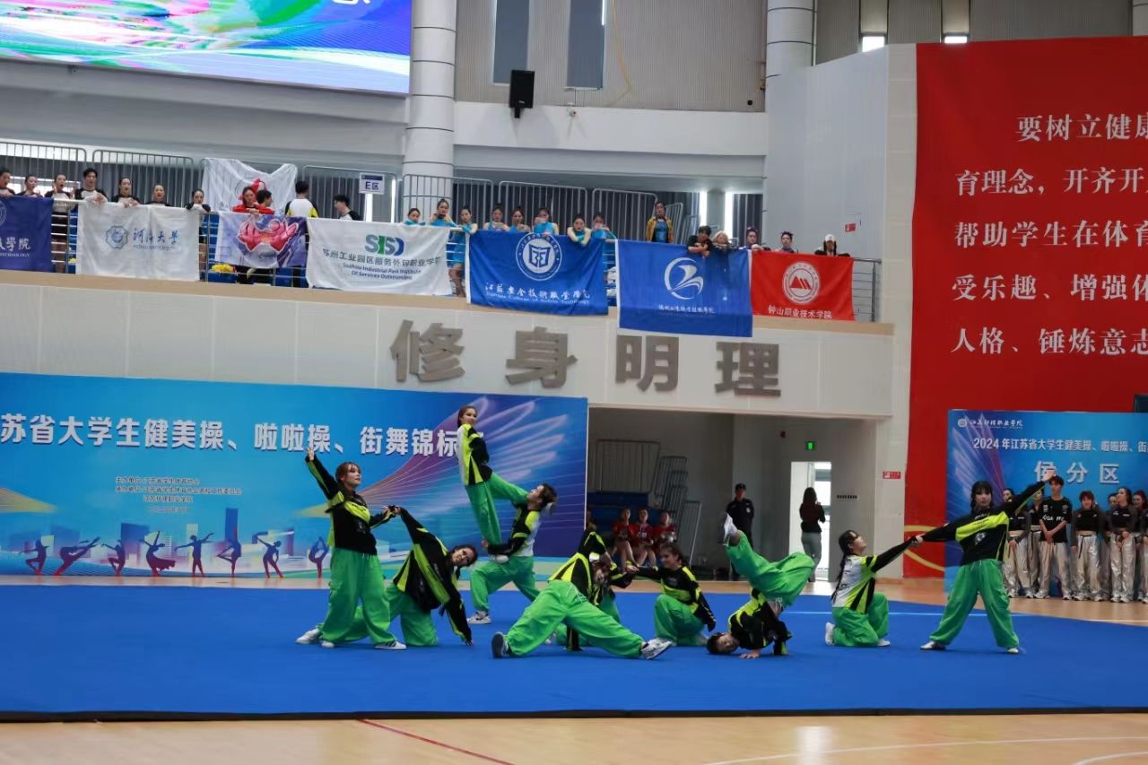本次比赛在5月24日至26日于江苏护理职业技术学院举行,本次比赛共有64所院校的1500余名运动员参赛,我校街舞和健美操队在领队吴春成主任带领下,田晶晶、张玉香两位教练的悉心指导下,以卓越的竞技状态和默契的团队配合,征服了评委和观众的心。