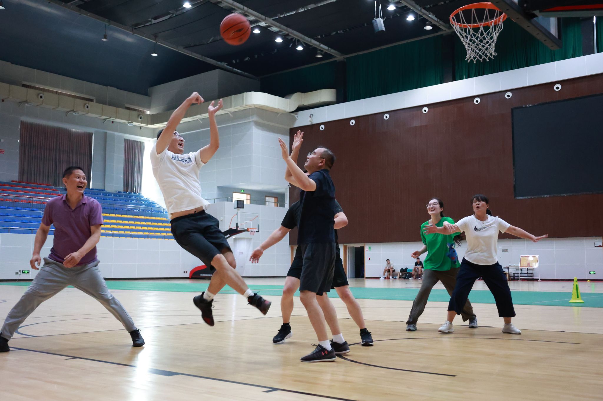 活动压轴环节——教师三人篮球交流赛热烈展开。各队精神饱满、配合默契,在激烈攻防中展现拼搏精神与团队风貌。赛场上的奔跑、传递与得分,不仅强健体魄,更增进了友谊与信任,提升了团队凝聚力与战斗力,生动诠释了健康生活、积极工作的理念。